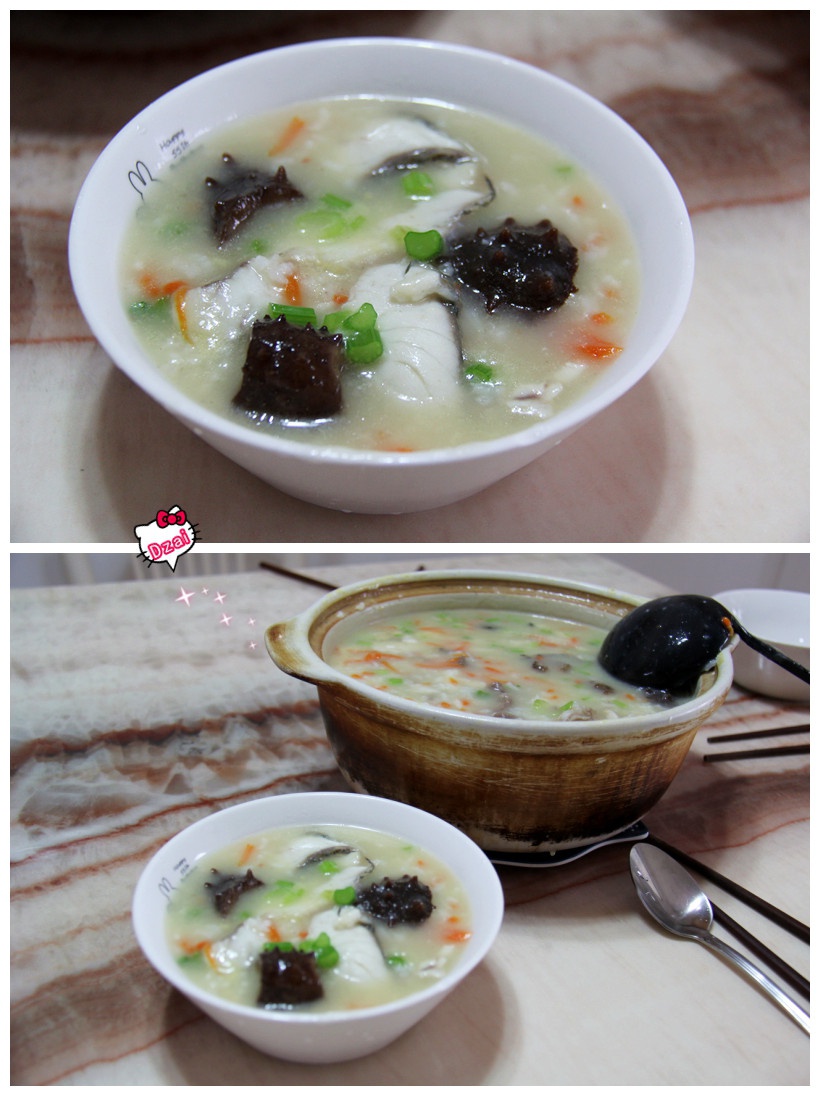 鱼片海参粥。先用几块排骨熬汤底。煮的时候加了一点胡萝卜和芹菜丁。下雨天热乎乎的来一碗。好暖!#小佳Dzai的回國海鮮專集...
