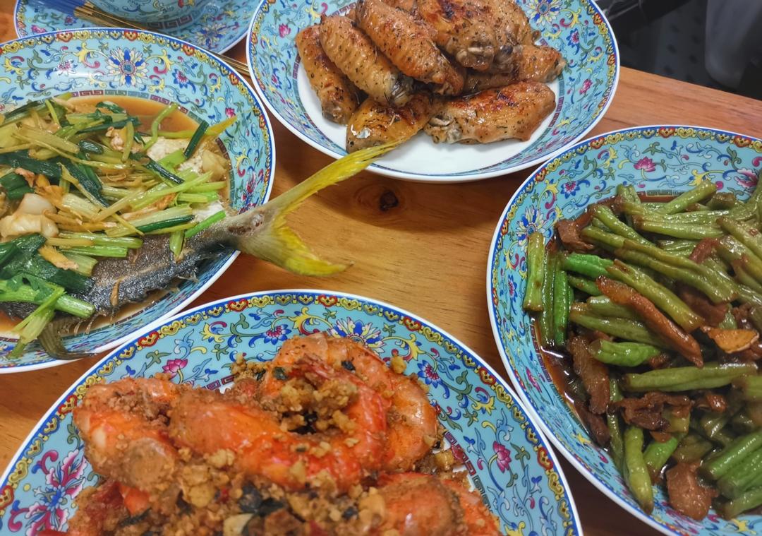 豆豉蒸排骨,煎鱼,盐焗虾,油麦菜。今天“神兽归笼”