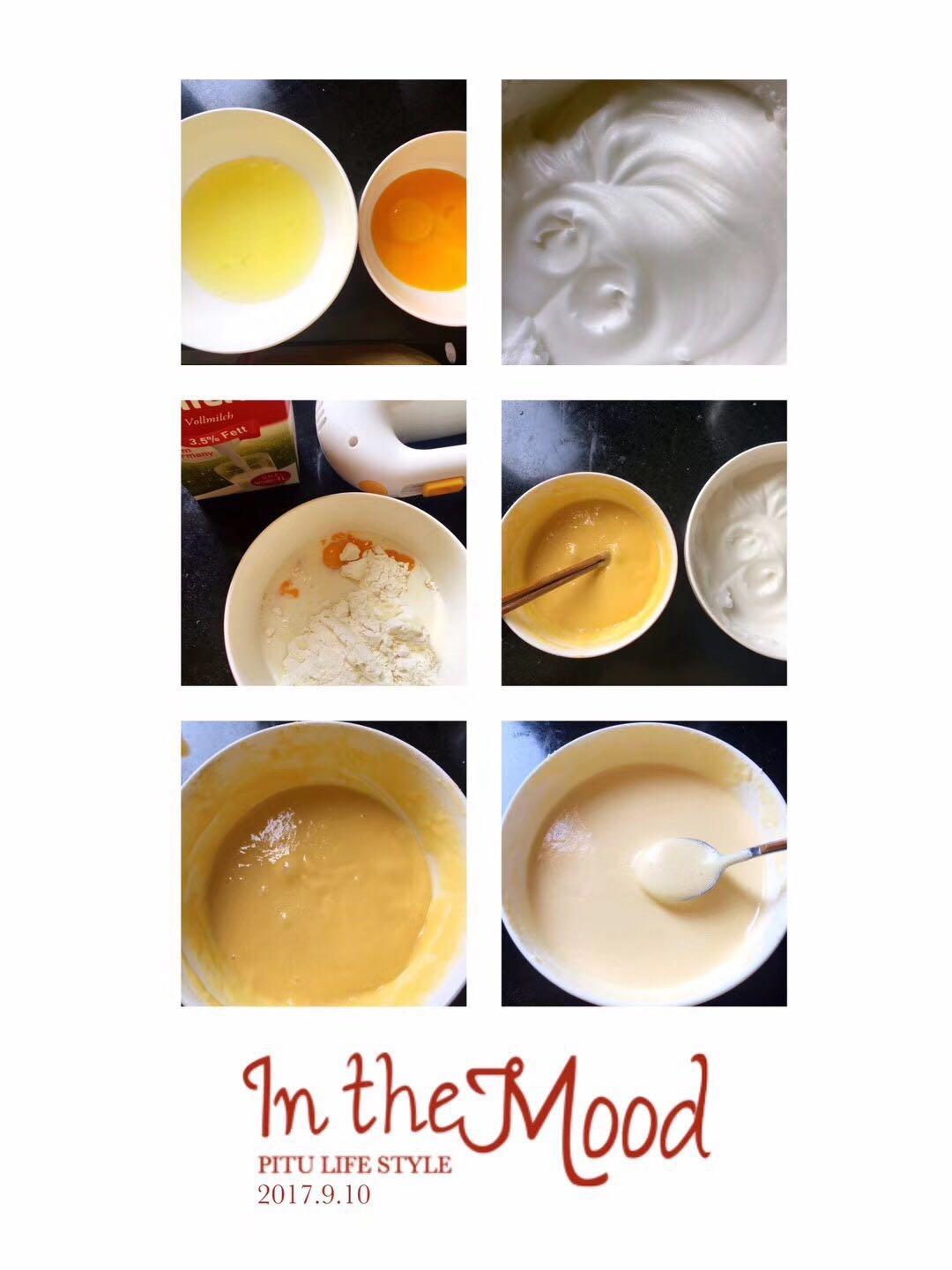 第二步:打发蛋白和蛋黄 2.1将蛋白和蛋黄分别打在2个碗里面备用。 2.2将面粉3勺、白糖1勺、牛奶7勺、半勺油倒在蛋黄里面(充分包裹蛋黄,容易打开)备用。 2.3用打蛋器打发蛋白,2勺白糖分两次加在蛋白里面打。要打到像奶油的那种状态,打蛋器拿起来的时候蛋白直立不掉。倒扣或倾斜蛋白也不会掉出来出来。 2.4继续用打蛋器打发蛋黄,这个时候只要打成有小泡泡打均匀就可以了,不要打过头了。