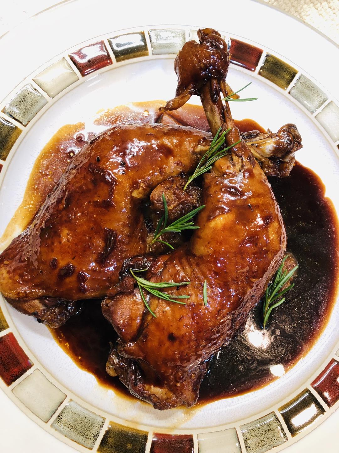 上桌前把酱汁大火煮开收汁,把变浓稠的酱汁浇到鸡腿上,再加点迷迭香之类的小香草点缀一下。😋